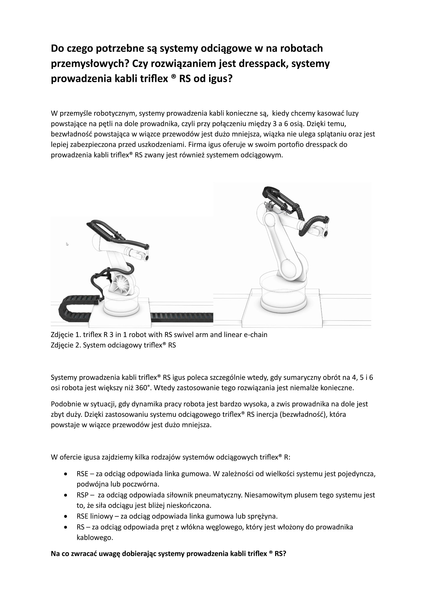 Do czego potrzebne są systemy odciągowe w na robotach przemysłowych? Czy rozwiązaniem jest dresspack, systemy prowadzenia kabli triflex ® RS od igus?