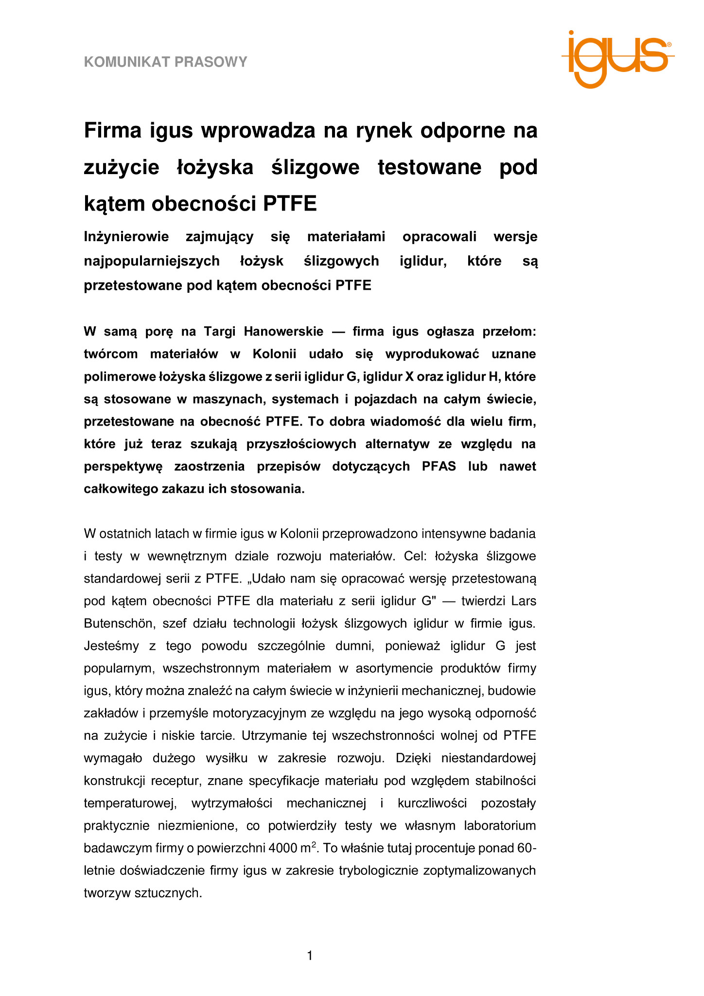 W samą porę na Targi Hanowerskie — firma igus ogłasza przełom: twórcom materiałów w Kolonii udało się wyprodukować uznane polimerowe łożyska ślizgowe z serii iglidur G, iglidur X oraz iglidur H, które są stosowane w maszynach, systemach i pojazdach na całym świecie, przetestowane na obecność PTFE. To dobra wiadomość dla wielu firm, które już teraz szukają przyszłościowych alternatyw ze względu na perspektywę zaostrzenia przepisów dotyczących PFAS lub nawet całkowitego zakazu ich stosowania.