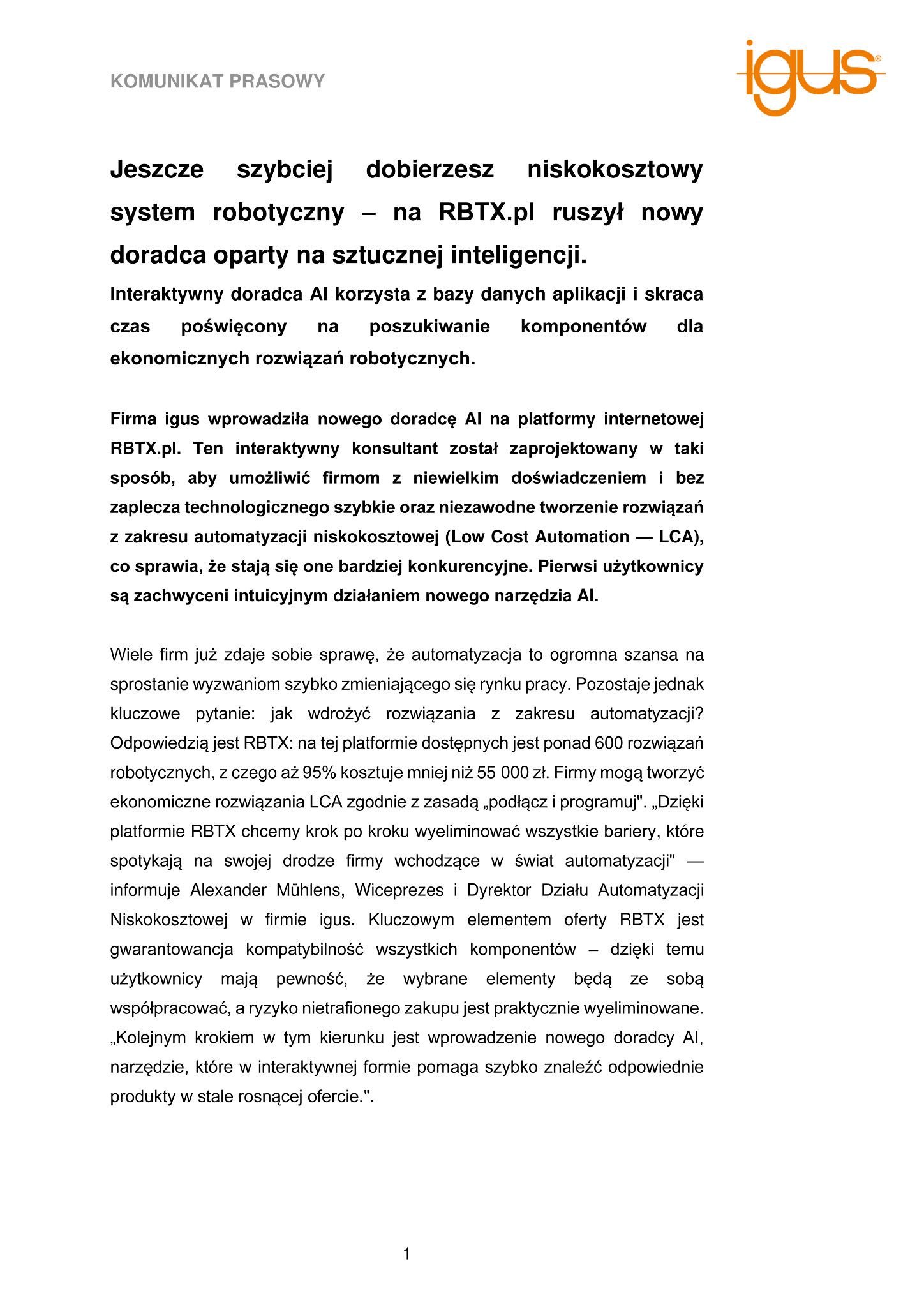 Wiele firm już zdaje sobie sprawę, że automatyzacja to ogromna szansa na sprostanie wyzwaniom szybko zmieniającego się rynku pracy. Pozostaje jednak kluczowe pytanie: jak wdrożyć rozwiązania z zakresu automatyzacji? Odpowiedzią jest RBTX: na tej platformie dostępnych jest ponad 600 rozwiązań robotycznych, z czego aż 95% kosztuje mniej niż 55 000 zł. Firmy mogą tworzyć ekonomiczne rozwiązania LCA zgodnie z zasadą „podłącz i programuj”. „Dzięki platformie RBTX chcemy krok po kroku wyeliminować wszystkie bariery, które spotykają na swojej drodze firmy wchodzące w świat automatyzacji” — informuje Alexander Mühlens, Wiceprezes i Dyrektor Działu Automatyzacji Niskokosztowej w firmie igus. Kluczowym elementem oferty RBTX jest gwarantowancja kompatybilność wszystkich komponentów – dzięki temu użytkownicy mają pewność, że wybrane elementy będą ze sobą współpracować, a ryzyko nietrafionego zakupu jest praktycznie wyeliminowane. „Kolejnym krokiem w tym kierunku jest wprowadzenie nowego doradcy AI, narzędzie, które w interaktywnej formie pomaga szybko znaleźć odpowiednie produkty w stale rosnącej ofercie.”.