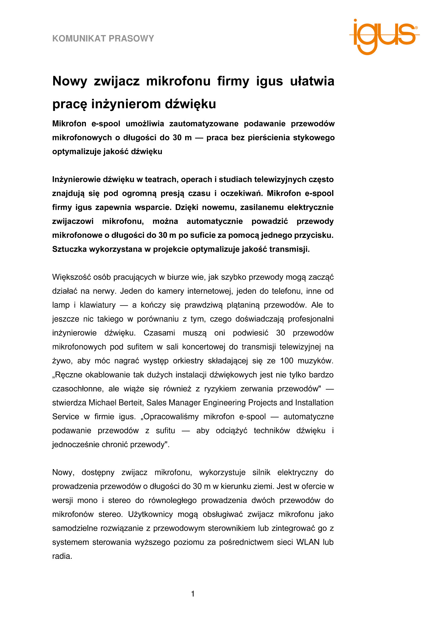 Większość osób pracujących w biurze wie, jak szybko przewody mogą zacząć działać na nerwy. Jeden do kamery internetowej, jeden do telefonu, inne od lamp i klawiatury — a kończy się prawdziwą plątaniną przewodów. Ale to jeszcze nic takiego w porównaniu z tym, czego doświadczają profesjonalni inżynierowie dźwięku. Czasami muszą oni podwiesić 30 przewodów mikrofonowych pod sufitem w sali koncertowej do transmisji telewizyjnej na żywo, aby móc nagrać występ orkiestry składającej się ze 100 muzyków. „Ręczne okablowanie tak dużych instalacji dźwiękowych jest nie tylko bardzo czasochłonne, ale wiąże się również z ryzykiem zerwania przewodów” — stwierdza Michael Berteit, Sales Manager Engineering Projects and Installation Service w firmie igus. „Opracowaliśmy mikrofon e-spool — automatyczne podawanie przewodów z sufitu — aby odciążyć techników dźwięku i jednocześnie chronić przewody”.