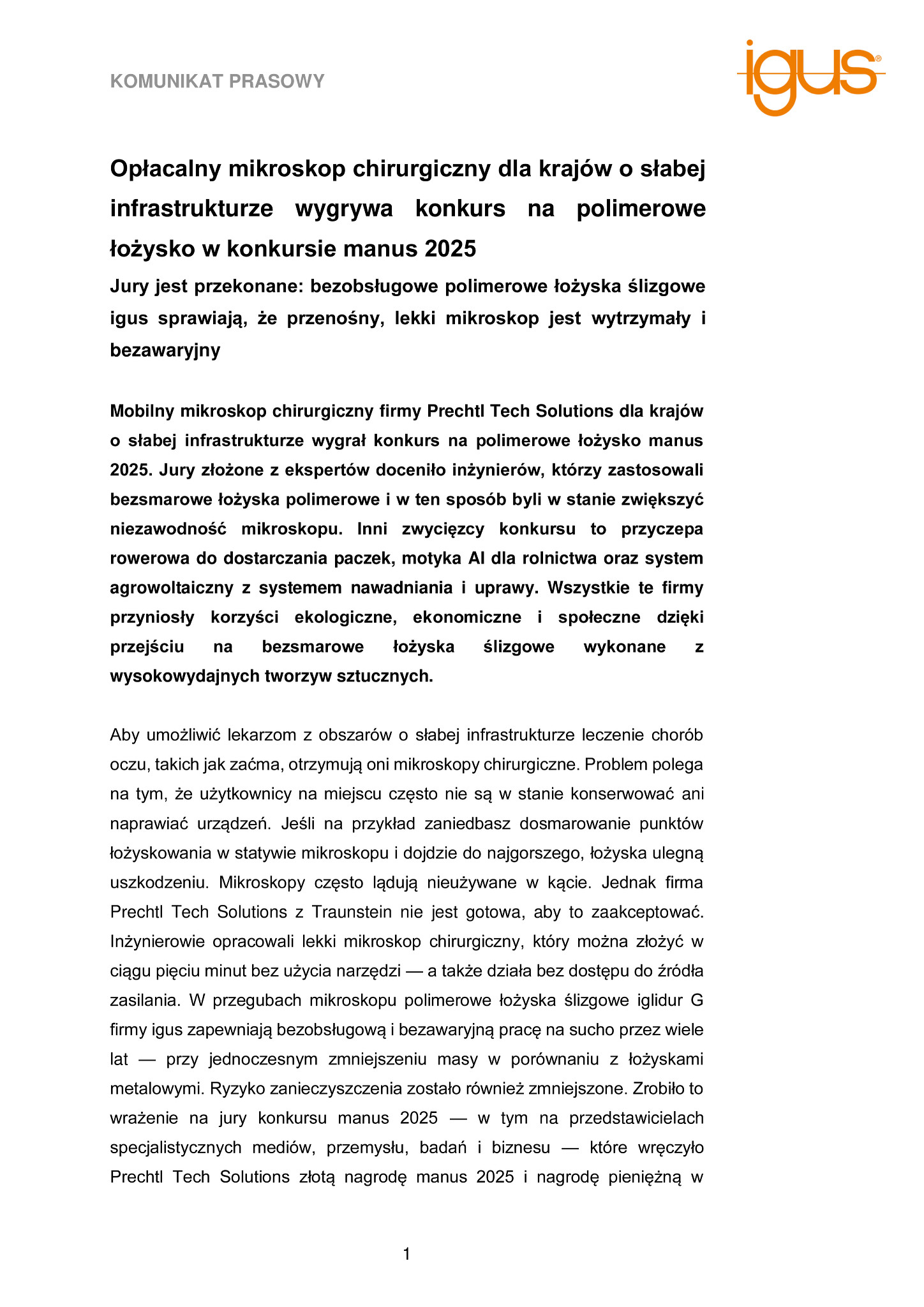 Mobilny mikroskop chirurgiczny firmy Prechtl Tech Solutions dla krajów o słabej infrastrukturze wygrał konkurs na polimerowe łożysko manus 2025. Jury złożone z ekspertów doceniło inżynierów, którzy zastosowali bezsmarowe łożyska polimerowe i w ten sposób byli w stanie zwiększyć niezawodność mikroskopu. Inni zwycięzcy konkursu to przyczepa rowerowa do dostarczania paczek, motyka AI dla rolnictwa oraz system agrowoltaiczny z systemem nawadniania i uprawy. Wszystkie te firmy przyniosły korzyści ekologiczne, ekonomiczne i społeczne dzięki przejściu na bezsmarowe łożyska ślizgowe wykonane z wysokowydajnych tworzyw sztucznych.