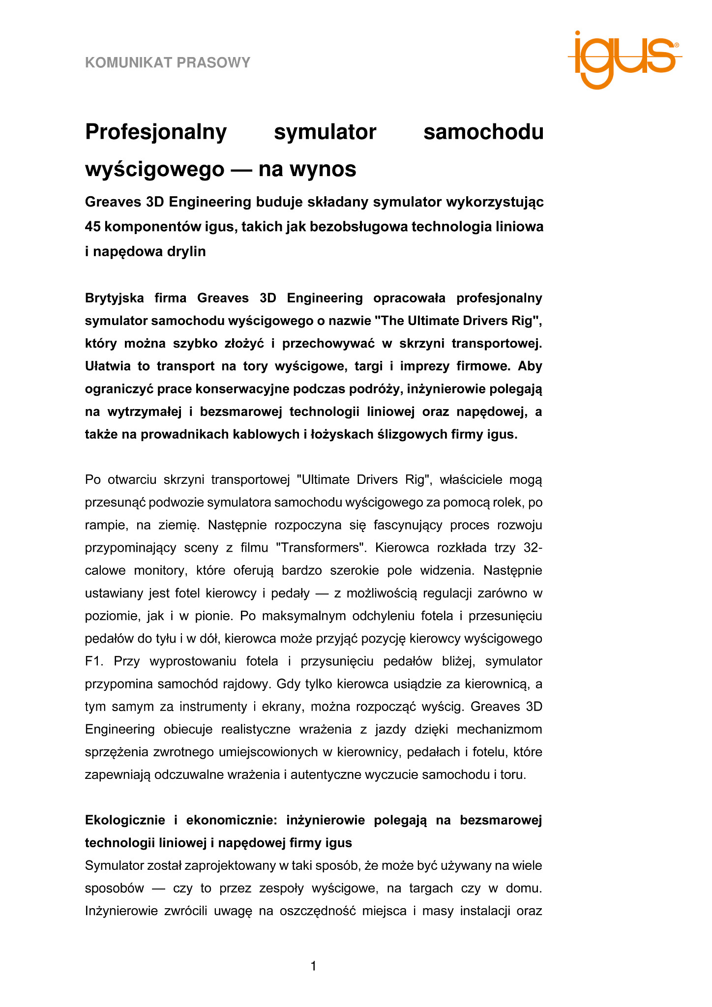 Brytyjska firma Greaves 3D Engineering opracowała profesjonalny symulator samochodu wyścigowego o nazwie „The Ultimate Drivers Rig”, który można szybko złożyć i przechowywać w skrzyni transportowej. Ułatwia to transport na tory wyścigowe, targi i imprezy firmowe. Aby ograniczyć prace konserwacyjne podczas podróży, inżynierowie polegają na wytrzymałej i bezsmarowej technologii liniowej oraz napędowej, a także na prowadnikach kablowych i łożyskach ślizgowych firmy igus.