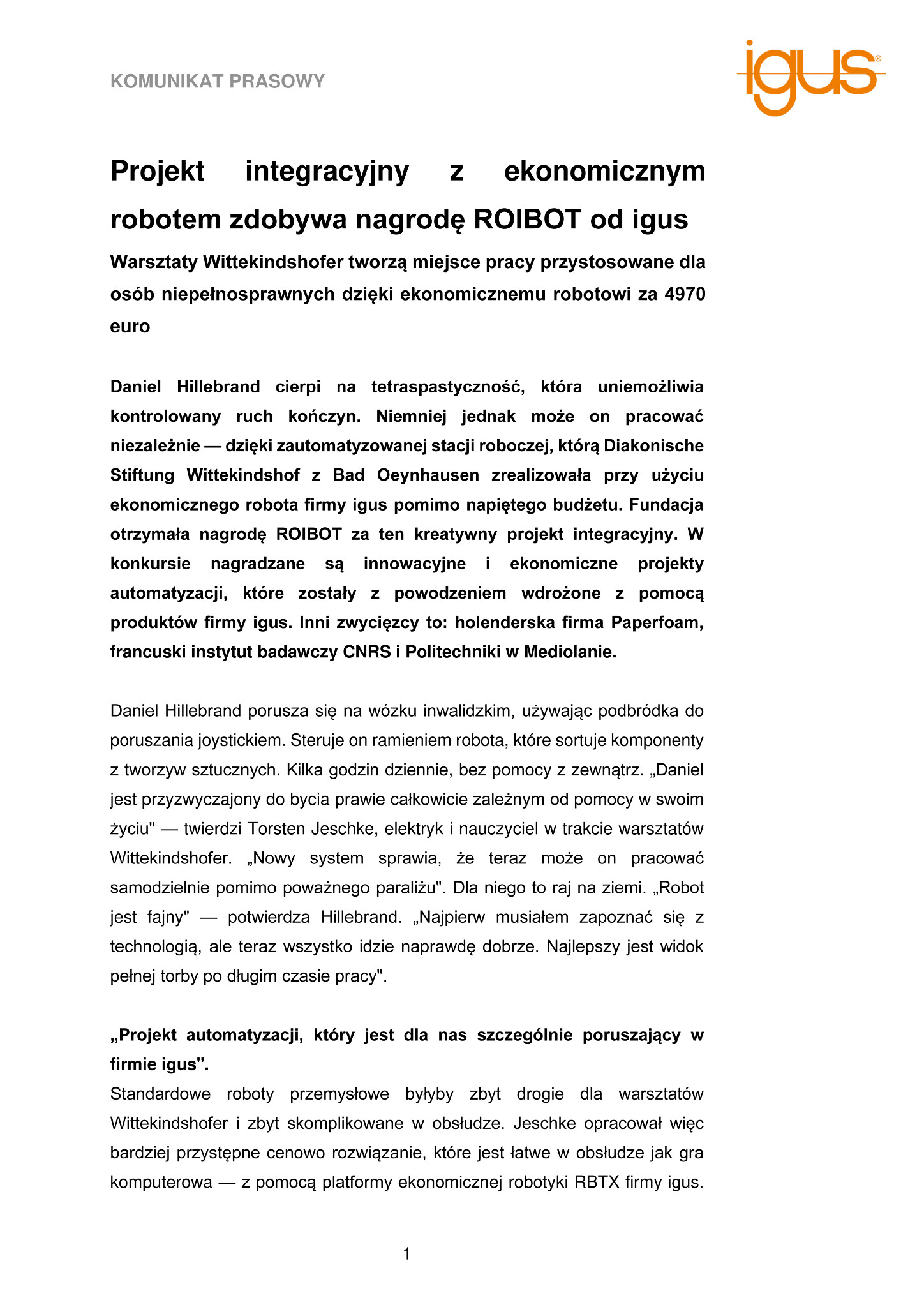 Daniel Hillebrand cierpi na tetraspastyczność, która uniemożliwia kontrolowany ruch kończyn. Niemniej jednak może on pracować niezależnie — dzięki zautomatyzowanej stacji roboczej, którą Diakonische Stiftung Wittekindshof z Bad Oeynhausen zrealizowała przy użyciu ekonomicznego robota firmy igus pomimo napiętego budżetu. Fundacja otrzymała nagrodę ROIBOT za ten kreatywny projekt integracyjny. W konkursie nagradzane są innowacyjne i ekonomiczne projekty automatyzacji, które zostały z powodzeniem wdrożone z pomocą produktów firmy igus. Inni zwycięzcy to: holenderska firma Paperfoam, francuski instytut badawczy CNRS i Politechniki w Mediolanie.