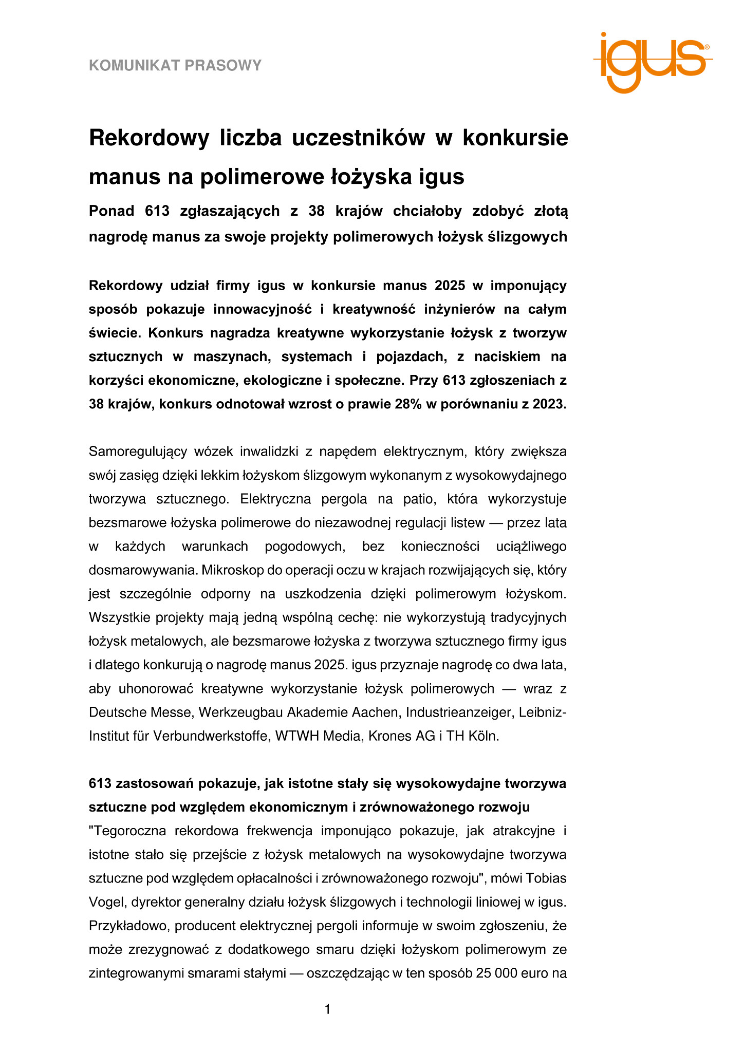 Rekordowy udział firmy igus w konkursie manus 2025 w imponujący sposób pokazuje innowacyjność i kreatywność inżynierów na całym świecie. Konkurs nagradza kreatywne wykorzystanie łożysk z tworzyw sztucznych w maszynach, systemach i pojazdach, z naciskiem na korzyści ekonomiczne, ekologiczne i społeczne. Przy 613 zgłoszeniach z 38 krajów, konkurs odnotował wzrost o prawie 28% w porównaniu z 2023.