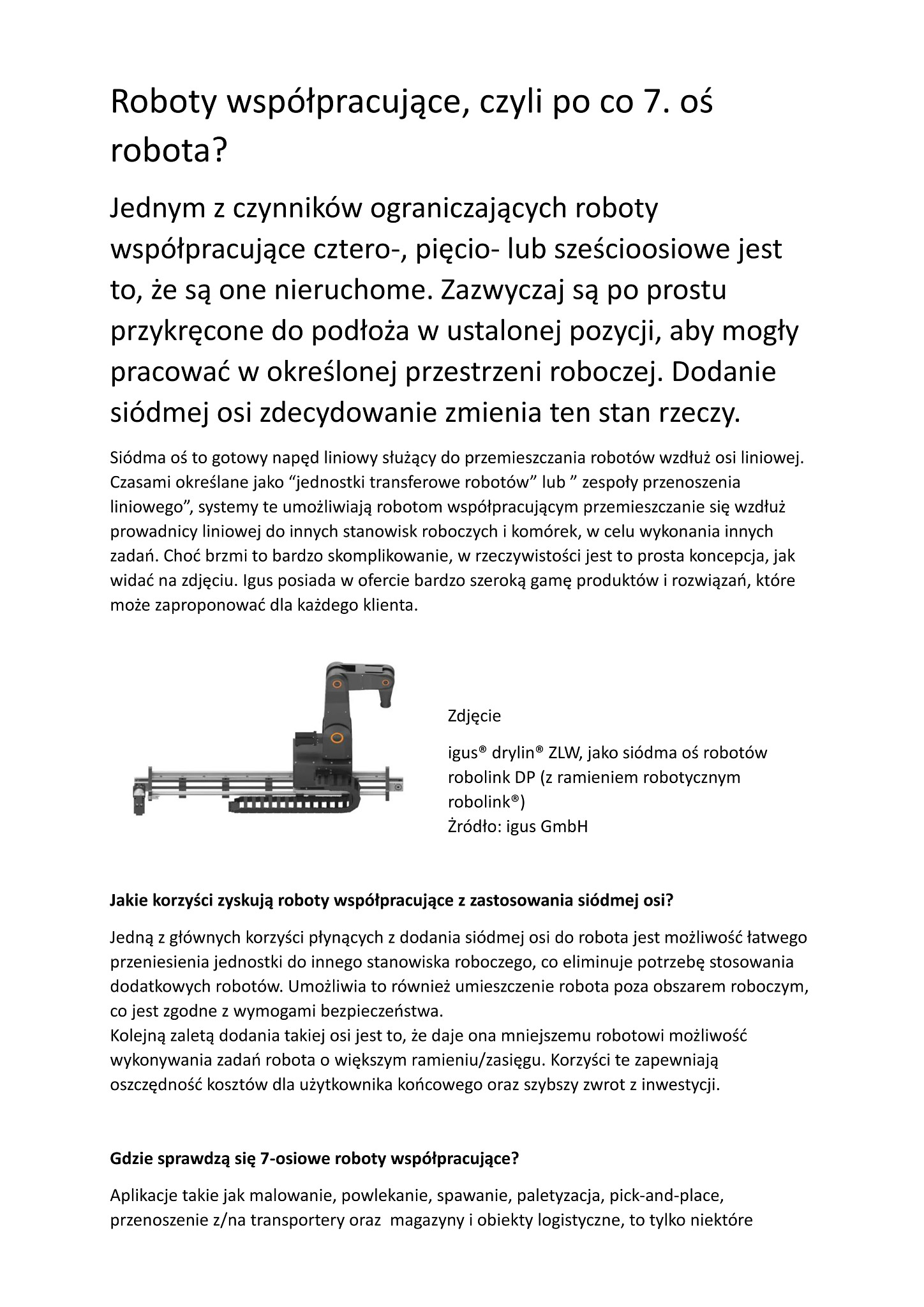 Siódma oś to gotowy napęd liniowy służący do przemieszczania robotów wzdłuż osi liniowej. Czasami określane jako “jednostki transferowe robotów” lub ” zespoły przenoszenia liniowego”, systemy te umożliwiają robotom współpracującym przemieszczanie się wzdłuż prowadnicy liniowej do innych stanowisk roboczych i komórek, w celu wykonania innych zadań. Choć brzmi to bardzo skomplikowanie, w rzeczywistości jest to prosta koncepcja, jak widać na zdjęciu. Igus posiada w ofercie bardzo szeroką gamę produktów i rozwiązań, które może zaproponować dla każdego klienta.